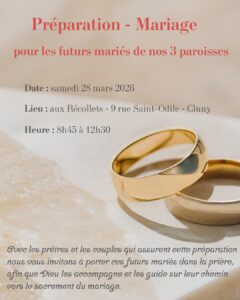 28mars 202608:45 Début 28mars 2026 12:30 Fin Chapelle des Recollets Cluny Lieu Partager cet événément Share on WhatsApp Share on Telegram Share on Facebook 𝕏 Share on X Share on Email + Ajouter à mon calendrier Date Mar 28 2026 Heure 8h45 - 12h30 + Ajouter à mon Agenda Google + Exportation iCal / Outlook